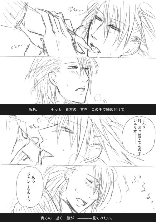 本当はルキーノの攻め方について「受けがつらいんだよ!!潤滑剤つかえ!!」といいまくるジャンのまんがを描いてたのですが